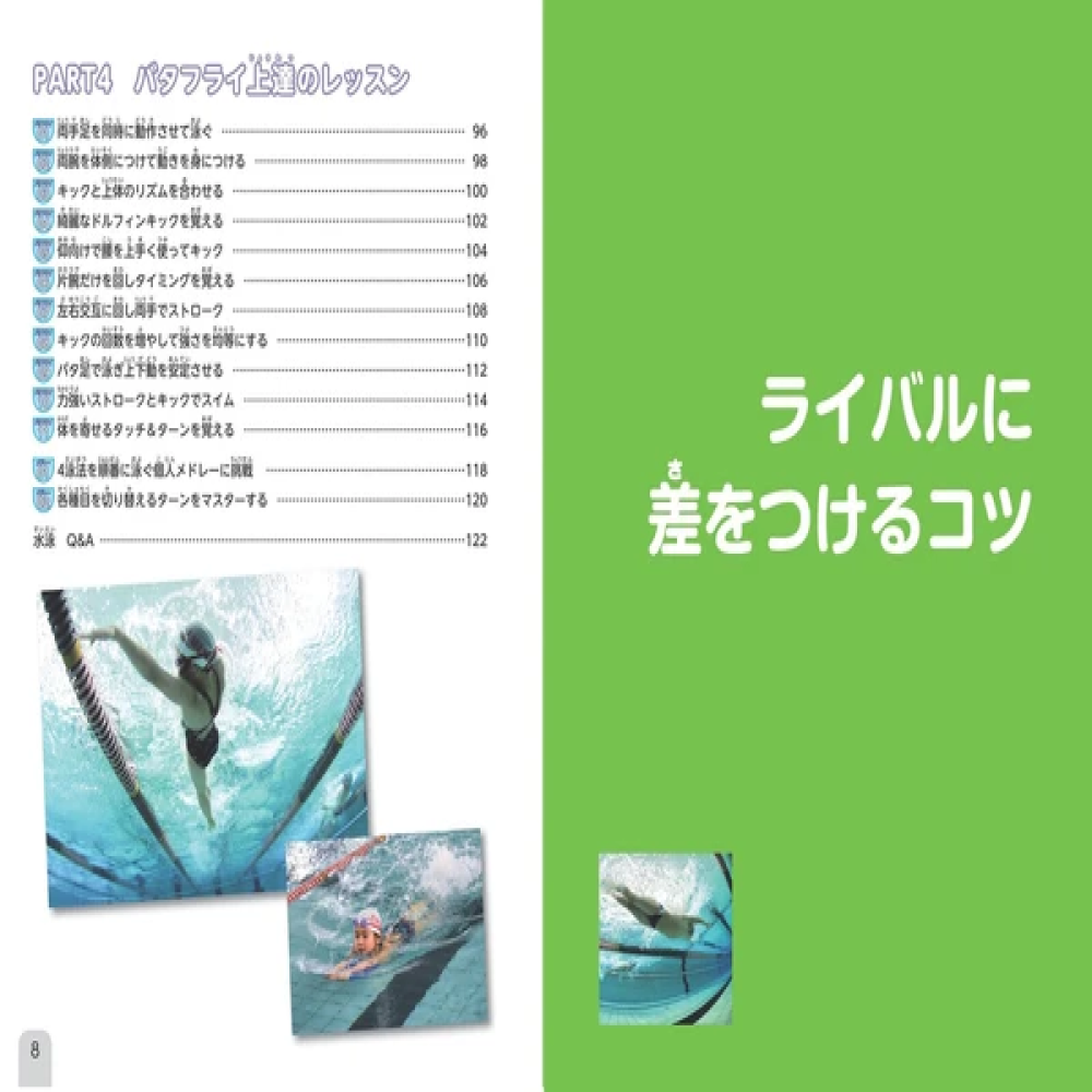★ 4泳法をもっと速く泳ぐ! クロール・背泳ぎ・平泳ぎ・バタフライ ★ 正しく身につけたい基本のおさらいから、 タイムを狙えるテクニックまで レベルアップの秘訣をつかもう! ★ 多くの日本代表選手を育てた指導者による、 『実力がぐんぐん伸びる』ポイントを凝縮! ◆◇◆ 監修者からのコメント ◆◇◆ 水泳にはクロールと背泳ぎ、平泳ぎ、バタフライ という泳法があり、これらを総じて四泳法と呼びます。 それぞれ体の使い方や呼吸の仕方が違うので、 選手によっては得意な泳法、不得意な泳法にわかれると思います。 しかし、ジュニア世代の育成においては、 四泳法をすべて身につけることが大切です。 なぜなら、どんなに速く泳げる選手であっても、 タイムの伸び悩み時期やスランプはやってきます。 そんなときひとつの泳法しか練習していない選手は行き詰ってしまいますが、 四泳法をマスターしている選手は、 たくさんの引き出しを持つことになります。 つまり「個人メドレー」をきれいに泳げることが、 選手として成長するためのカギを握るのです。 この本では、四泳法をまんべんなくマスターできるように、 それぞれの泳法にあった練習法を消化しています。 クロールや背泳ぎで大切なキックやローリング、 平泳ぎで重要になるキック、 バタフライのストロークのポイントなど、 難しい動作であっても段階的に練習を積み重ねることで、 上達できるレッスンとなっています。 レースの勝ち負けはあまり気にせずに、 水泳を楽しみ、熱中することが大事です。 この本が四泳法上達の手助けとなれば幸いです。 柏洋スイマーズ 森 謙一郎 ◆◇◆ 主な目次 ◆◇◆ ☆ PART1 クロール上達のレッスン * クロールを身につけるべき動作を知る * 水の抵抗の少ないキックを覚える * ビート板を持たずにキックする ・・・など ☆ PART2 背及び上達のレッスン * 背泳ぎの動作のポイントをチェックする * 仰向けになってバタ足で進む ・・・など ☆ PART3 平泳ぎ上達のレッスン * 推進力あるキックを意識する * 引いてから後ろに押すキックを覚える ・・・など ☆ PART4 バタフライ上達のレッスン * 両手足を同時に動作させて泳ぐ * 両腕を体側につけて動きを身につける ・・・など